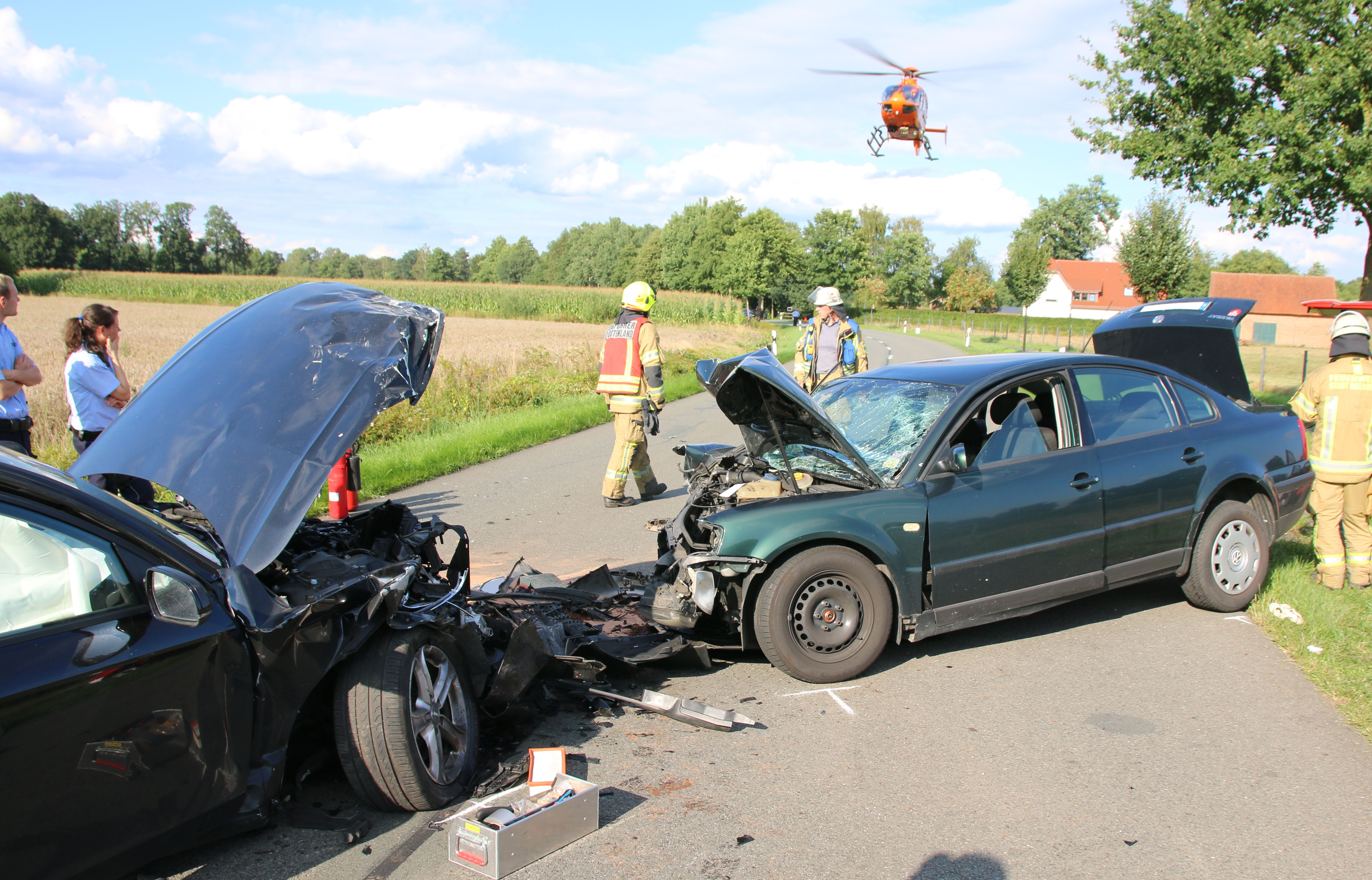 Vier, teils schwer verletzte Personen forderte ein schwerer Verkehrsunfall auf der Ostenländer Straße, einer von ihnen musste wegen des Verdachts auf Rückenverletzungen mit einen Rettungshubschrauber in ein Bielefelder Klinikum geflogen werden. Ein weiterer Fahrzeugführer wurde schwer verletzt. An beiden Fahrzeugen entstand Totalschaden.
