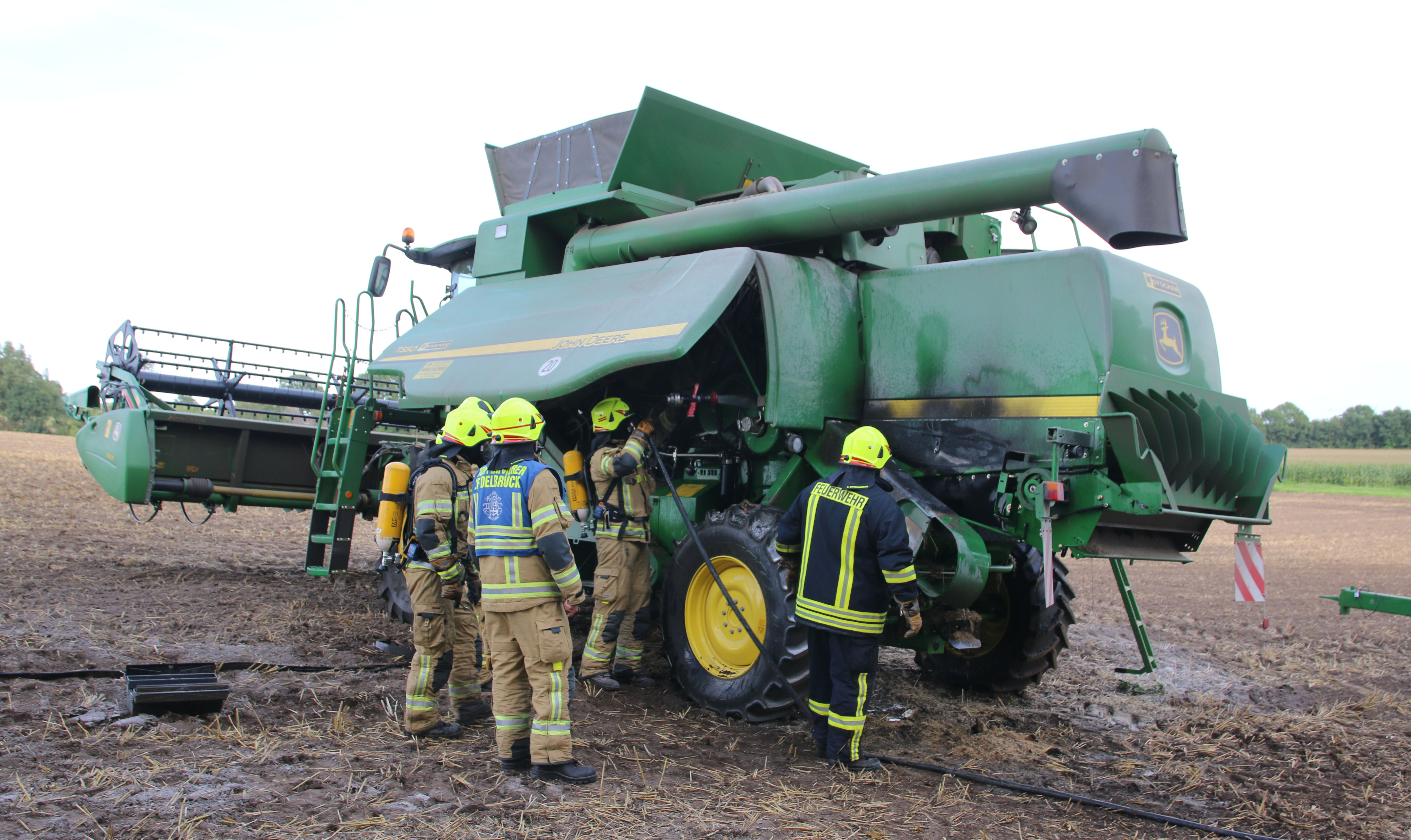 Am Montag, den 31.07. geriet gegen 18:15 Uhr ein Mähdrescher auf einem Feld an der Rieger Straße in Sudhagen in Brand. Der Fahrer konnte das brennende Gefährt noch auf ein abgeernteten Bereich eines Feldes fahren, sodass eine Brandausbreitung auf das Feld und somit ein Flächenbrand verhindert wurde. Anschließend dämmte er das Feuer mit Hilfe eines Feuerlöschers soweit ein, dass die alarmierten Kräfte vom Löschzug Delbrück lediglich Nachlöscharbeiten durchführen und den Brandbereich mit einer Wärmebildkamera kontrollieren mussten.