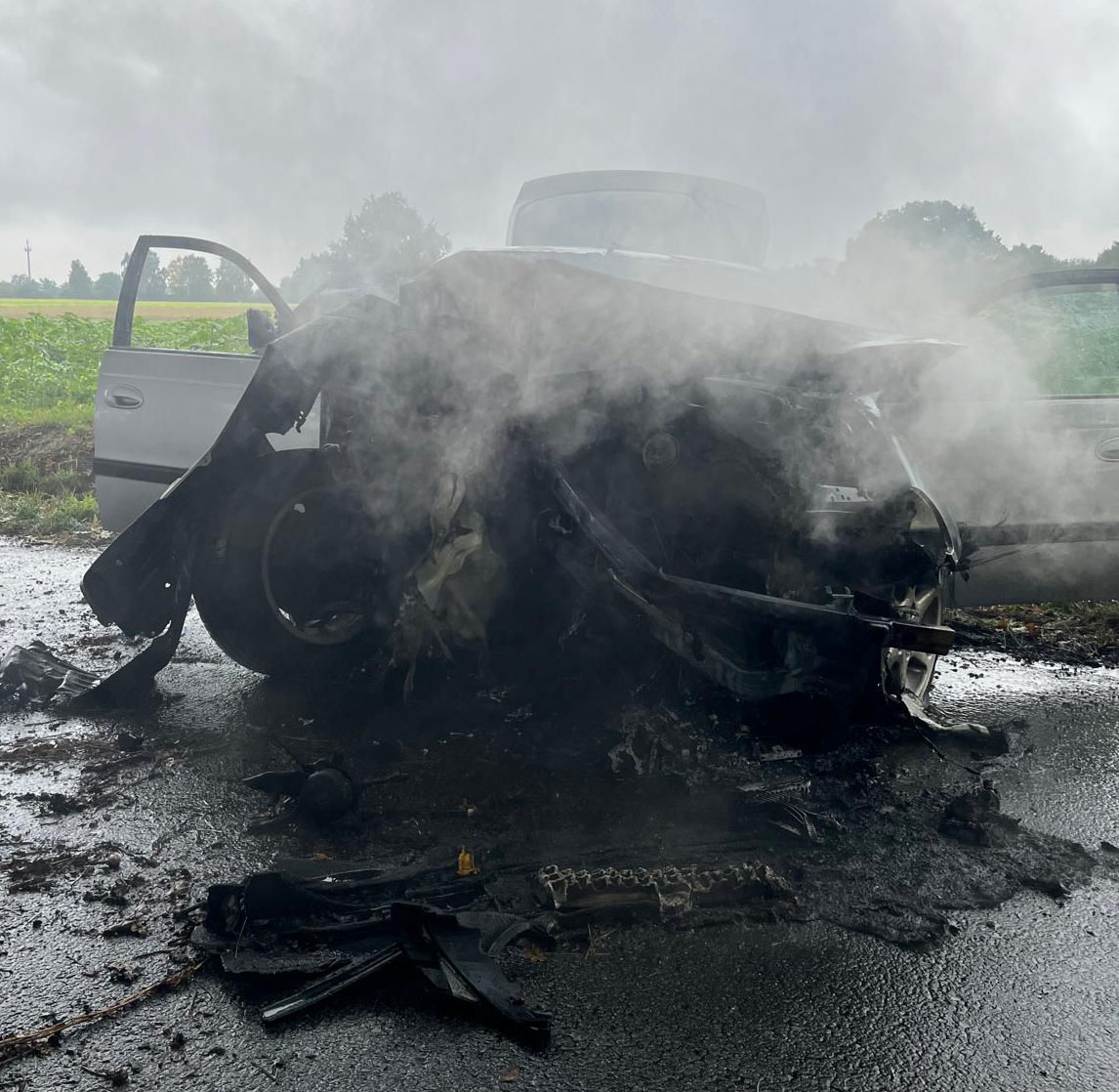 Der 37-jährige Fahrer befuhr die Knäppenstraße in Richtung Westenholz und geriet auf nasser Straße ins Rutschen. Der Toyota T22 geriet auf die Bankette und der Fahrer verlor die Kontrolle. Anschließend prallte das Auto auf der gegenüberliegenden Seite gegen einen Baum. Das Auto prallte zurück und kam mit dem Heck abseits der Straße zum Stillstand. Der 37-jährige konnte sich mit leichteren Verletzungen selber aus dem Fahrzeug befreien. Feuerwehrkräfte der Löschzüge Westenholz und Delbrück rückten zu dem zunächst gemeldeten Kleinbrand aus. Unter schwerem Atemschutz nahmen die Feuerwehrleute die Brandbekämpfung des mit einem Verbrennermotor ausgestatten PkW auf. Allerdings gab es für den PkW keine Rettung mehr, er brannte weitestgehend aus.