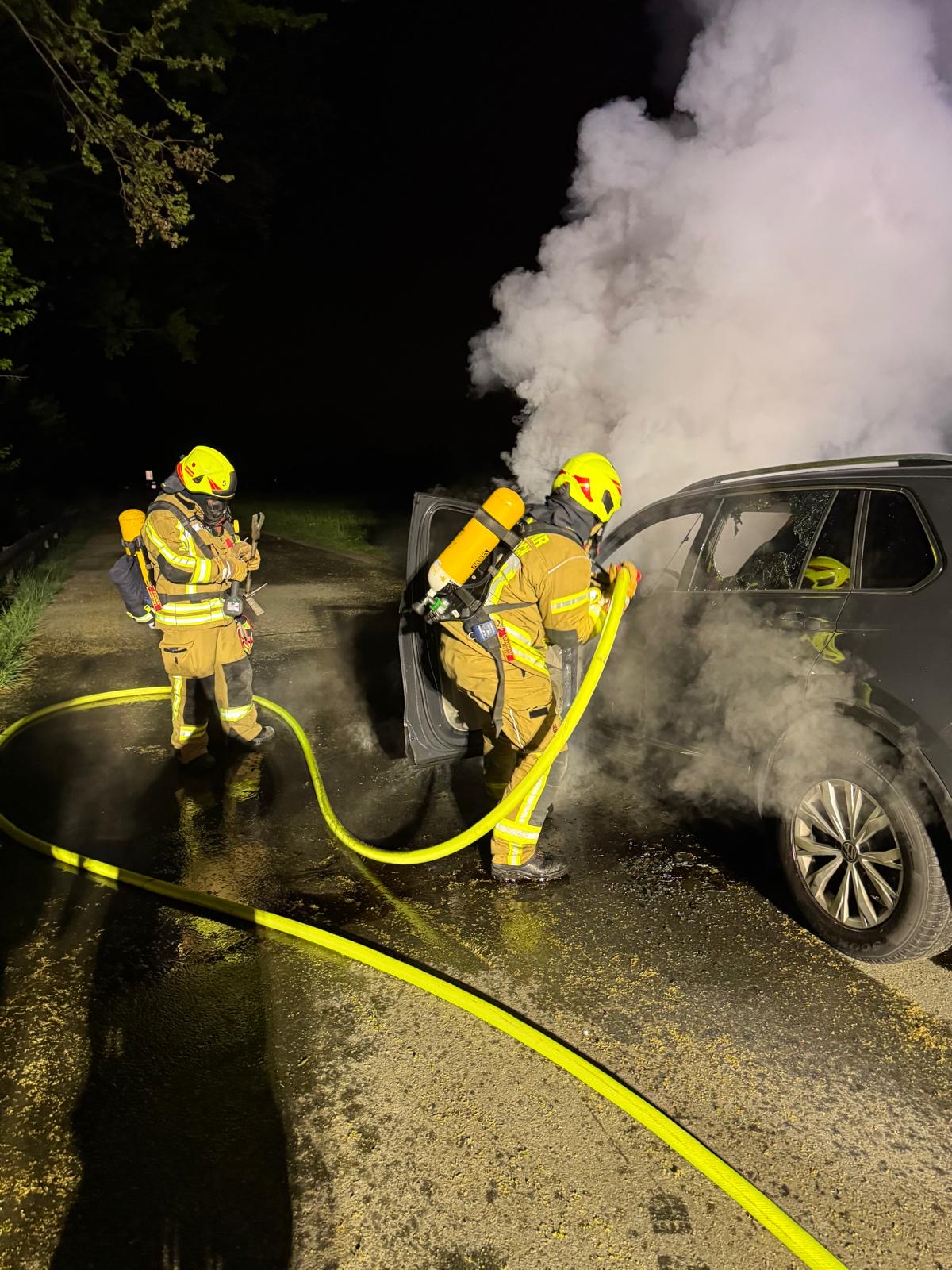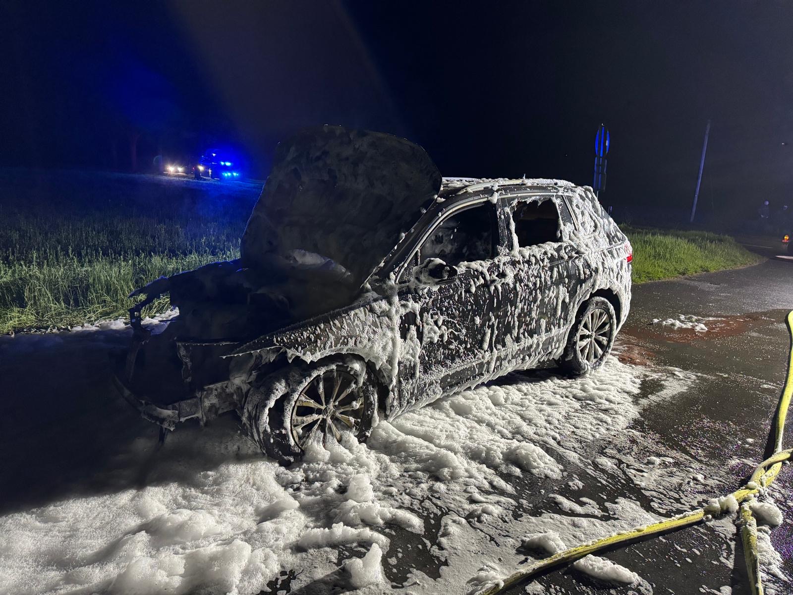Delbrück-Bentfeld. Um 22.00 Uhr alarmierte die Leitstelle des Kreises unter dem Stichwort „Pkw-Brand“ die Feuerwehr Delbrück, die umgehend mit dem Löschzug Bentfeld unter der Leitung von Stefan Peitz zur Brandstelle ausrücke. Unter Atemschutz begannen die Feuerwehrleute mit dem Löschangriff. Trotz des raschen Löscherfolgs konnte die Feuerwehr den Totalverlust des Wagens nicht verhindern. Später kümmerten sich die Einsatzkräfte um das Batteriemanagement und streuten ausgelaufene Betriebsstoffe ab, so Heinz Noje, Leiter der Feuerwehr Delbrück, der ebenfalls zur Brandstätte gefahren war. Das Wrack wurde später geborgen und abgeschleppt.