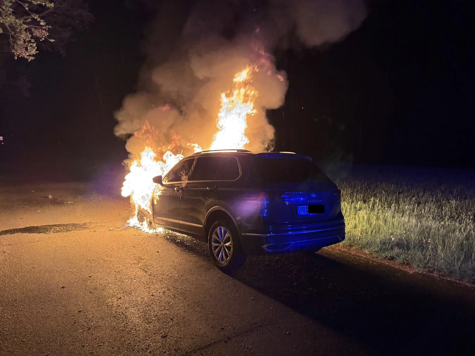 Bei einem Fahrzeugbrand auf der Heddinghauser Straße im Delbrücker Stadtteil Bentfeld wurde am Sonntagabend ein VW durch die Flammen vollkommen zerstört. Auf der Fahrt bemerkte der Fahrer eine Rauchentwicklung im Fahrzeug, hielt an, verließ den bereits brennenden Wagen und wählte den Notruf.